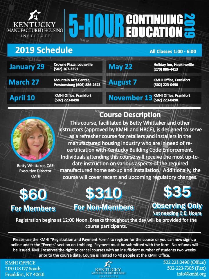 This course, facilitated by Betty Whittaker and other instructors (approved by KMHI and HBCE), is designed to serve as a refresher course for retailers and installers in the manufactured housing industry who are in need of recertification with Kentucky Building Code Enforcement. Individuals attending this course will receive the most up-to-date instruction on various aspects of the required manufactured home set-up and installation. Additionally, the course will cover recent and upcoming regulatory changes.