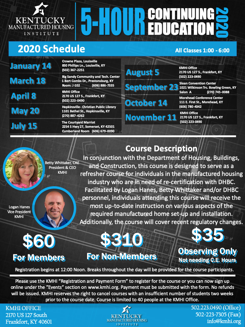 In conjunction with the Department of Housing, Buildings, and Construction, this course is designed to serve as a refresher course for individuals in the manufactured housing industry who are in need of re-certification with DHBC. Facilitated by Logan Hanes, Betty Whittaker and/or DHBC personnel, individuals attending this course will receive the most up-to-date instruction on various aspects of the required manufactured home set-up and installation. Additionally, the course will cover recent regulatory changes.
