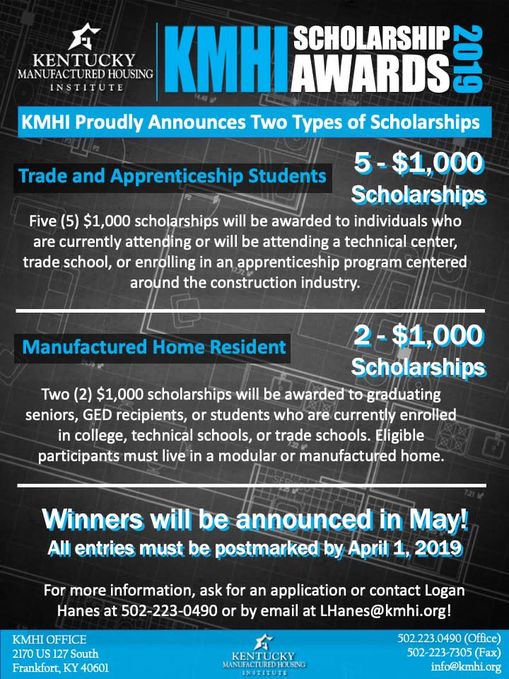 KMHI member retailers and communities are encouraged to offer the enclosed application to deserving students who will be attending one of the aforementioned schools/apprenticeship programs or currently reside in a modular, manufactured, or mobile home. One application has been included; however, if you need more applications you can make a copy of the enclosed application or contact Logan Hanes at KMHI by phone at 502-223-0490 in Frankfort or by email at LHanes@kmhi.org. Completed applications must be post-marked no later than April 1, 2019.
