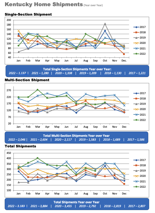In October 2022, 8,685 new manufactured homes were shipped, a decrease of 678 homes or 7.2 percent compared to September 2022, and a decrease of 562 homes or 6.1 percent compared to October 2021. Compared with the same month last year, shipments of both single-section and multi- section homes were down, by 0.5 percent and 10.2 percent, respectively. Total floors shipped in October 2022 were 13,478, a decrease of 1,144 floors or 7.8 percent compared with the same month last year.