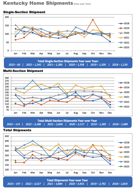 In January 2023, 6,933 new manufactured homes were shipped, an increase of 522 homes or 8.1 percent compared to December 2022, yet a decrease of 2,177 homes or 23.9 percent compared to January 2022. Compared with the same month last year, shipments of both single-section and multisection homes were down, by 22.5 percent and 24.7 percent, respectively. Total floors shipped in January 2023 were 10,799, a decrease of 3,459 floors or 24.3 percent compared with the same month last year.