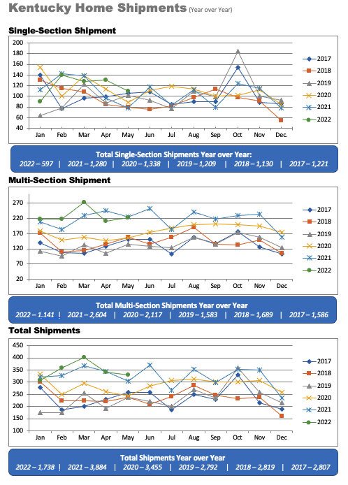 Cumulative shipments for January through May this year totaled 50,278 homes compared with 44,328 homes for the same five months of 2021, a net increase of 13.4 percent.